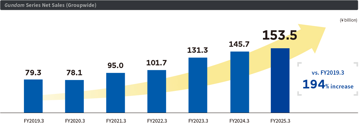 Net sales from the Gundam series on a Groupwide basis have grown significantly over the past six fiscal years—from ¥79.3 billion in FY2019.3, the start of the Mid-term Plan preceding the previous one, to ¥153.5 billion in FY2025.3, the final year of the previous Mid-term Plan—nearly doubling in size. As a result, we reached one year early our net sales target in FY2026.3 of ¥150.0 billion.