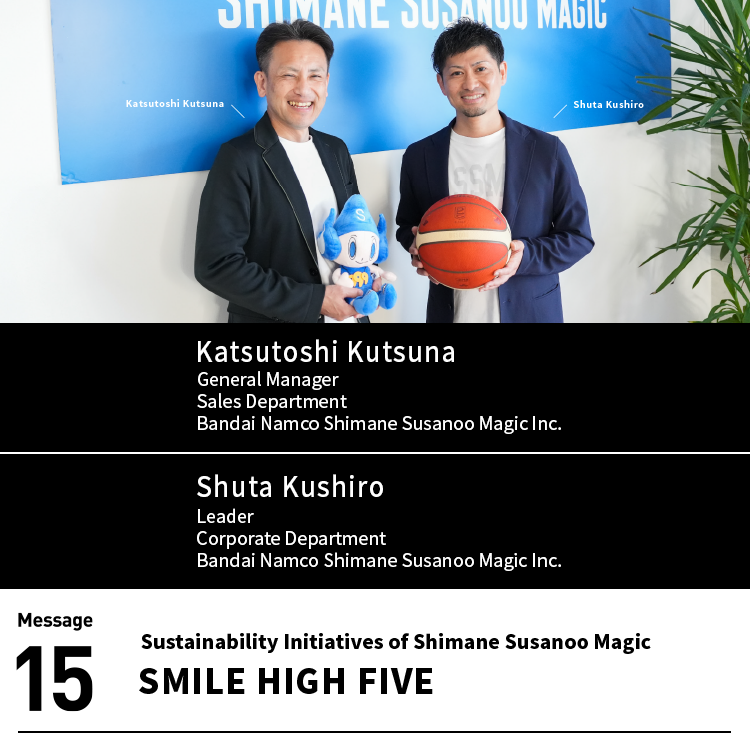 This project was launched thanks to our strong desire to make the Shimane Susanoo Magic a team that plays an indispensable role in the local community. Although awareness of SMILE HIGH FIVE was at first limited and engagement in activities under the project was not widespread, efforts are now underway to actively promote greater participation in the project among the players, staff members, and the local community. While awareness of the project among the local community and fans is still growing, we aim to steadily advance SMILE HIGH FIVE by continuing to focus on earnest, day-to-day activities and actively sharing information about the project.
