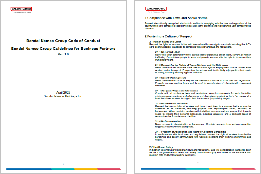 As part of these efforts, in April 2025, we formulated the Bandai Namco Group Code of Conduct, which compiles the principles of conduct that all officers and employees must abide by and that we ask our business partners to comply with. We have shared the contents of the Code of Conduct with our business partners. We have also established and are promoting awareness of the Bandai Namco Group Guidelines for Business Partners to guide the implementation of the Code of Conduct.