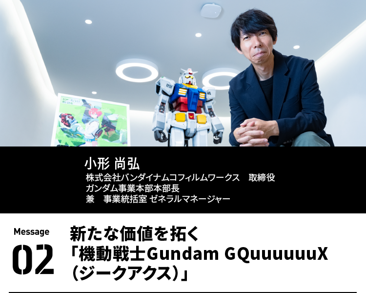 ガンダムは長きにわたってファンとともに歩むことで育成されてきたIPです。今後はファンとの輪をさらに広げることを重要なテーマとしています。来るべき50周年は、世代や国境を越えてガンダムへの認知が拡大した状態で迎えたいと考えています。ガンダムの歴史は、常に新しいことへの挑戦です。私自身、守りの姿勢ではなく、攻めの姿勢で未来を切り拓き、挑戦を恐れず、ガンダムというIPをより大きく、より自由に発展させ、IPの可能性を広げていきます。