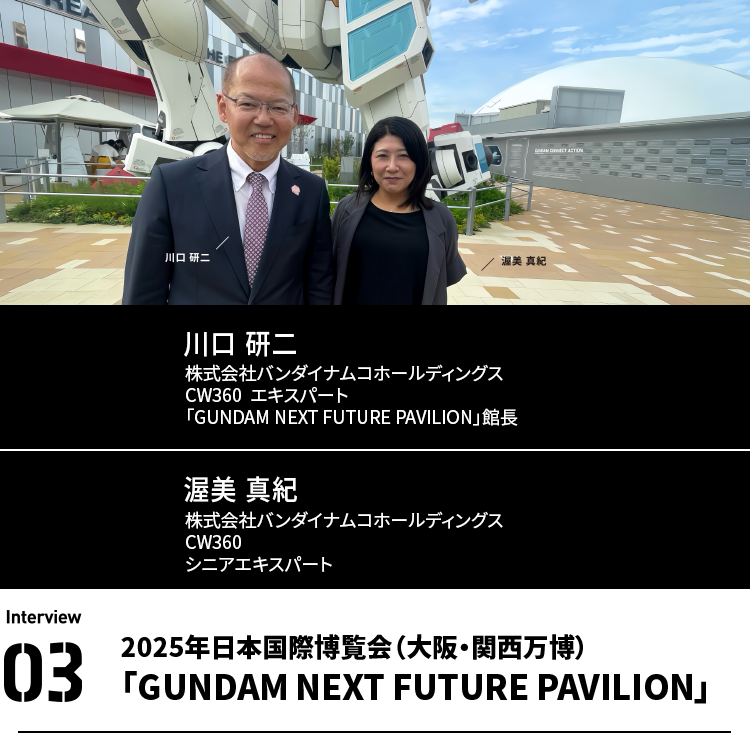 本パビリオンは、新たなファン層の開拓にもつながり、ガンダムのIP価値最大化に大きく貢献を果たしていると言えます。ガンダムを通じて世界中の人々とつながり、ともに「未来」を考えるきっかけの場となれるよう、これからも全力を尽くしていきます。