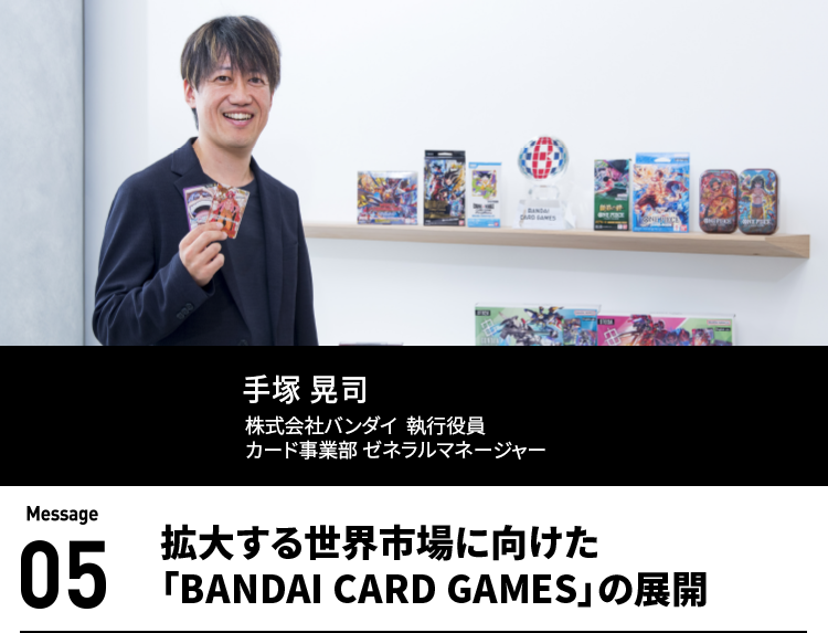 2025年春、幕張で開かれた「BANDAI CARD GAMES Fest」には、約2万人のお客様が来場されました。会場を埋め尽くすその熱量に、私は心から感動しました。TCGは「モノ」にこだわり、様々な喜怒哀楽をもたらす、リアルなコミュニケーションの場です。その素晴らしさを1人でも多くの方々に広めていきたいと思います。