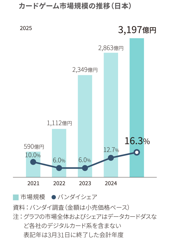 当事業部の主力は、トレーディングカードゲーム(TCG)です。1990年代に誕生した比較的新しいジャンルながら、第1世代のお客様がハイターゲット(大人)層を形成するにつれ、事業環境に大きな追い風が吹いています。2025年3月期のカードゲーム国内市場規模(P.59のグラフ参照)は3,197億円(前期比11.7%増)で、日本と最大市場の北米地域を中心に、グローバル市場でも堅調に拡大する見通しです。