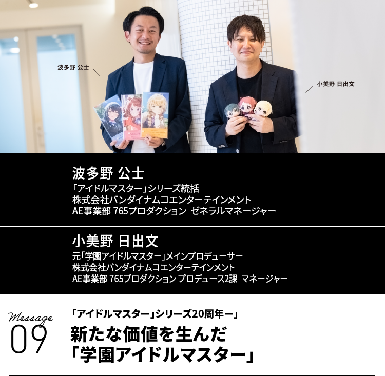 また、より多彩な事業と接続することも戦略の1つです。ゲームから触れるファンもいれば、音楽、映像やライブから興味を持つファンもおり、過去から多岐にわたるタッチポイントを増やしてきたことが、「学マス」にも触れる機会を増加させたと考えています。バンダイナムコグループは、ゲームコンテンツだけでなく、様々な事業分野を持っているからこそ、スピード感を持って多面的な展開を実現できることが大きな強みです。展開については、もちろんグループ内に閉じず、様々なパートナーと取り組みますが、IPの展開方針においてはグループ内で完結することでコミュニケーションが取りやすく、素早い決断と実行が可能です。