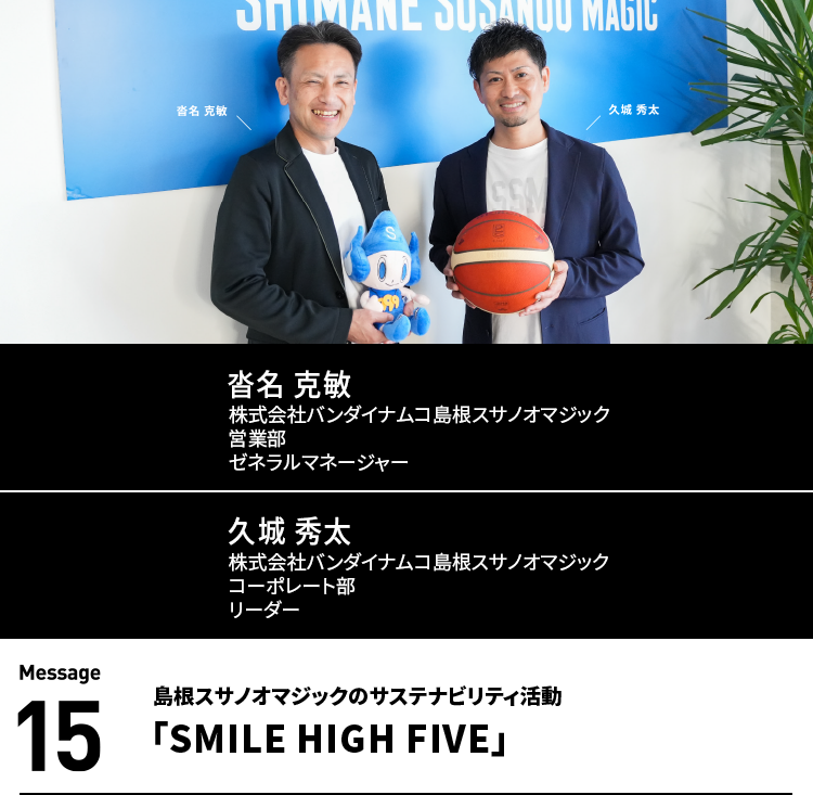 私たちが活動を発足させた背景には、島根スサノオマジックとして地域の人々から必要とされる存在になりたいという強い想いがあります。発足当初は、チーム内での横展開が十分ではなく、活動への認知も浸透していなかったものの、現在では選手をはじめとする関係者や地域に向けて、活動を発信する流れが生まれつつあります。地域やファンへの浸透はまだこれからですが、地道に目の前のことに取り組み続け、情報発信に努めながら着実に歩んでいきたいと考えています。