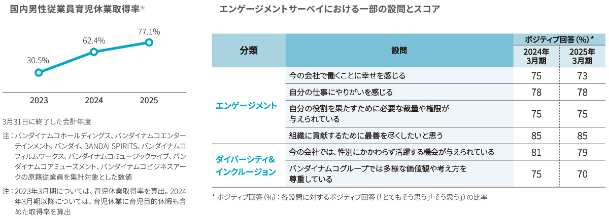 2024年3月期において課題となった項目に、国内の従業員を対象とした男性育児休業取得環境がありますが、育児休業取得率としては大きく改善がはかられました (グラフ参照)。この育児休業取得に加え、育児目的休暇も含めた取得率で換算すると、2025年3月期は84.4%となりました。e-Learningやセミナーなどの情報発信を通じた丁寧な啓発活動が実を結び、結果につながったと感じています。一方で、個社ごとの結果でバラつきがあるといった課題もあり、個社の特性を考慮したうえで全体として改善が必要だと認識しています。この調査については、グループ従業員のエンゲージメントを把握し、組織としての課題を可視化するものとして捉え、成長環境の醸成に活かしながら引き続き実施していきます。