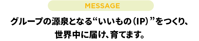 “いいもの”の追求こそがファンから支持され、ひいてはグループの事業拡大に大きく影響します。今後も映像音楽ユニットが生み出す多彩なIPを通じ、世界中のファンとつながることで、今この時を生きる喜び、ともに楽しめる喜びを共有し、感動の渦に巻き込んでいけるような“いいもの”をつくり続けていきます。