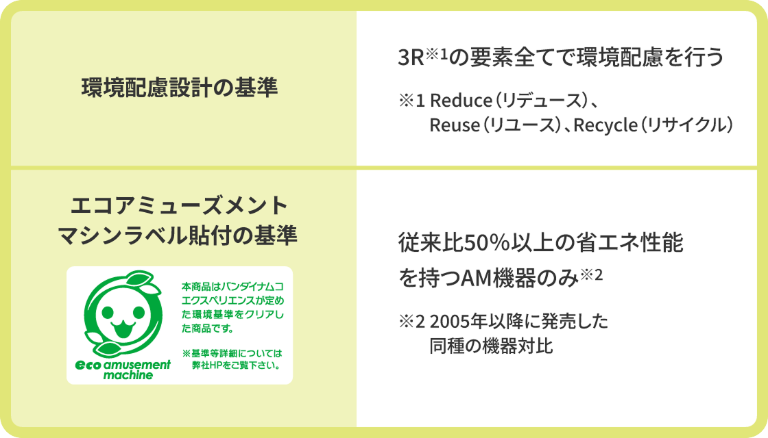 バンダイナムコエクスペリエンスは2005年からグリーン調達に取り組んできました。2012年からは、国内で販売するアーケードゲーム機を対象に「エコアミューズメント製品要求事項」を策定。「グリーン調達基準適合」「省電力」「省資源」など、7つの基準において一定基準をクリアした製品を「エコアミューズメント」と認定しています。