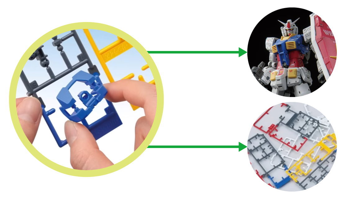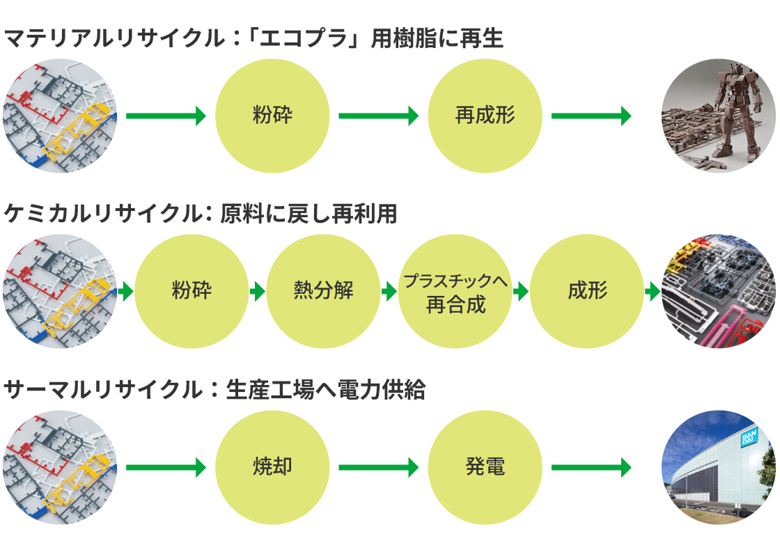 また、「ケミカルリサイクル」は、ランナーを化学的に分解し、元々の形態である石油まで戻して新品のプラスチックをつくるという新技術として注目を集めています。マテリアルリサイクルと比べて、より自由度高くさまざまな製品へと生まれ変わらせることができます。2025年4月には、ケミカルリサイクル樹脂を使用したプラモデルの実用化が叶いました。