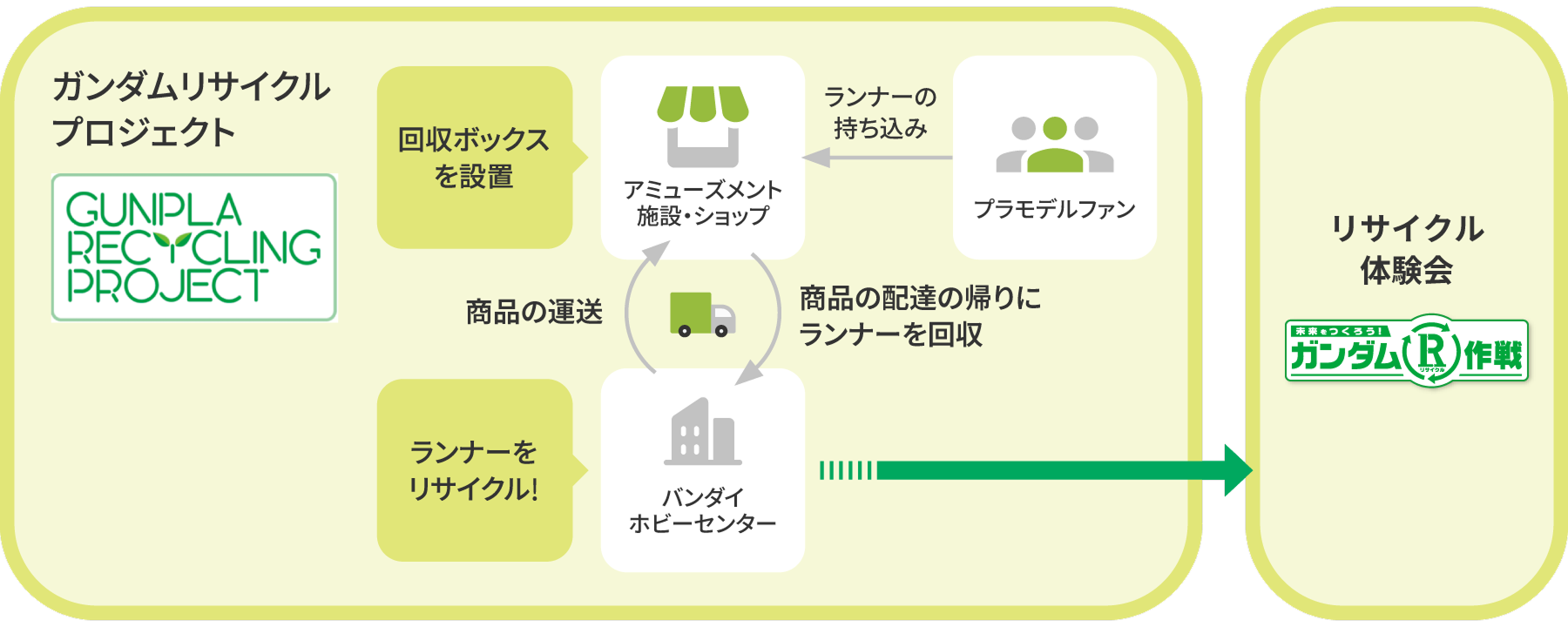 誕生から45周年を迎えた『機動戦士ガンダム』シリーズのプラモデル“ガンプラ”。そこから生まれた「ガンプラリサイクルプロジェクト」は、ファンの皆さまの協力のもとプラモデルの枠の部分である「ランナー」を回収し、生まれ変わらせるプロジェクトです。