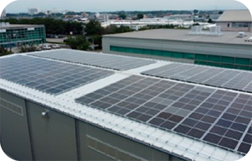 建物の屋上にたくさんの太陽光パネルを設置。得られた電力は建物の中で使っています。